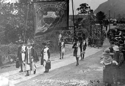 Dolgarrog Victory Celebrations, 1919 - part of the procession including members of the Royal Antediluvian Order of Buffaloes carrying banner.