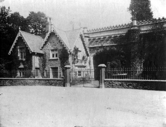 Lodge of Llanfair Hall, between Griffiths Crossing and Portdinorwic [Y Felinheli], with railway line above archway.